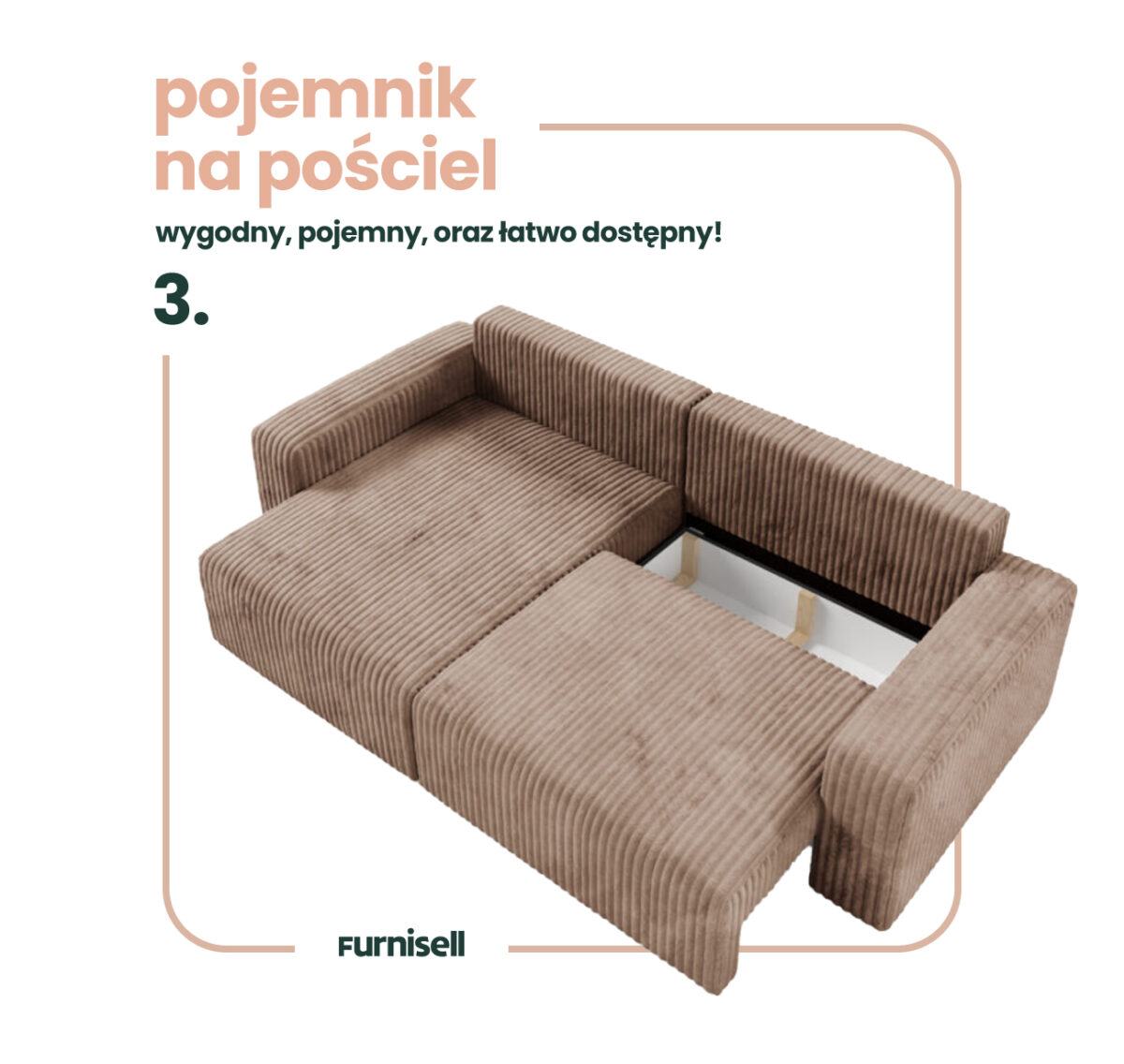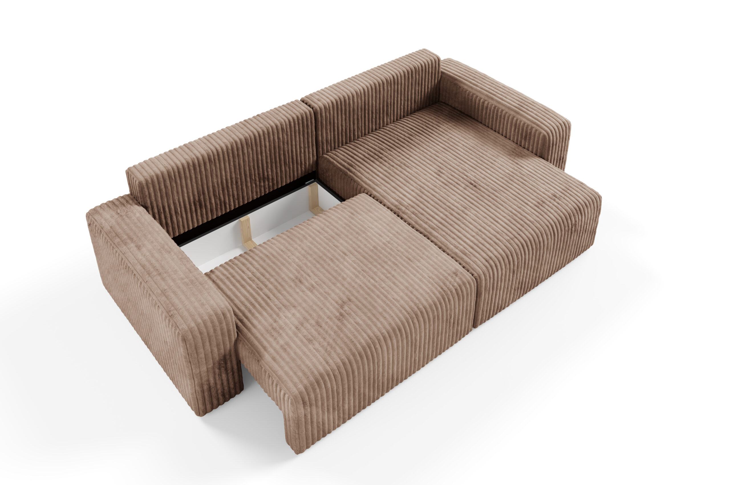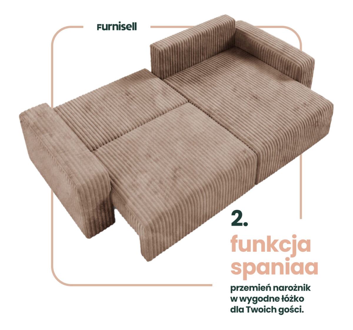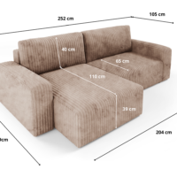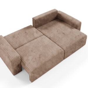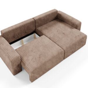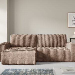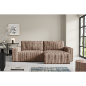 Obicie z miękkiego sztruksu Top Sztruks nadaje Fano niepowtarzalnego charakteru – struktura materiału dodaje mu wizualnej głębi i sprawia, że mebel jest przyjemny w dotyku, a jednocześnie praktyczny i trwały. Narożnik posiada funkcje spania oraz cechuje się komfortem siedzenia oraz nowoczesnym stylem, który znakomicie odnajduje się w przestronnych salonach, wnętrzach typu loft i nowoczesnych aranżacjach. Boki mebla podkreślają jego solidną sylwetkę, tworząc elegancką i spójną formę.