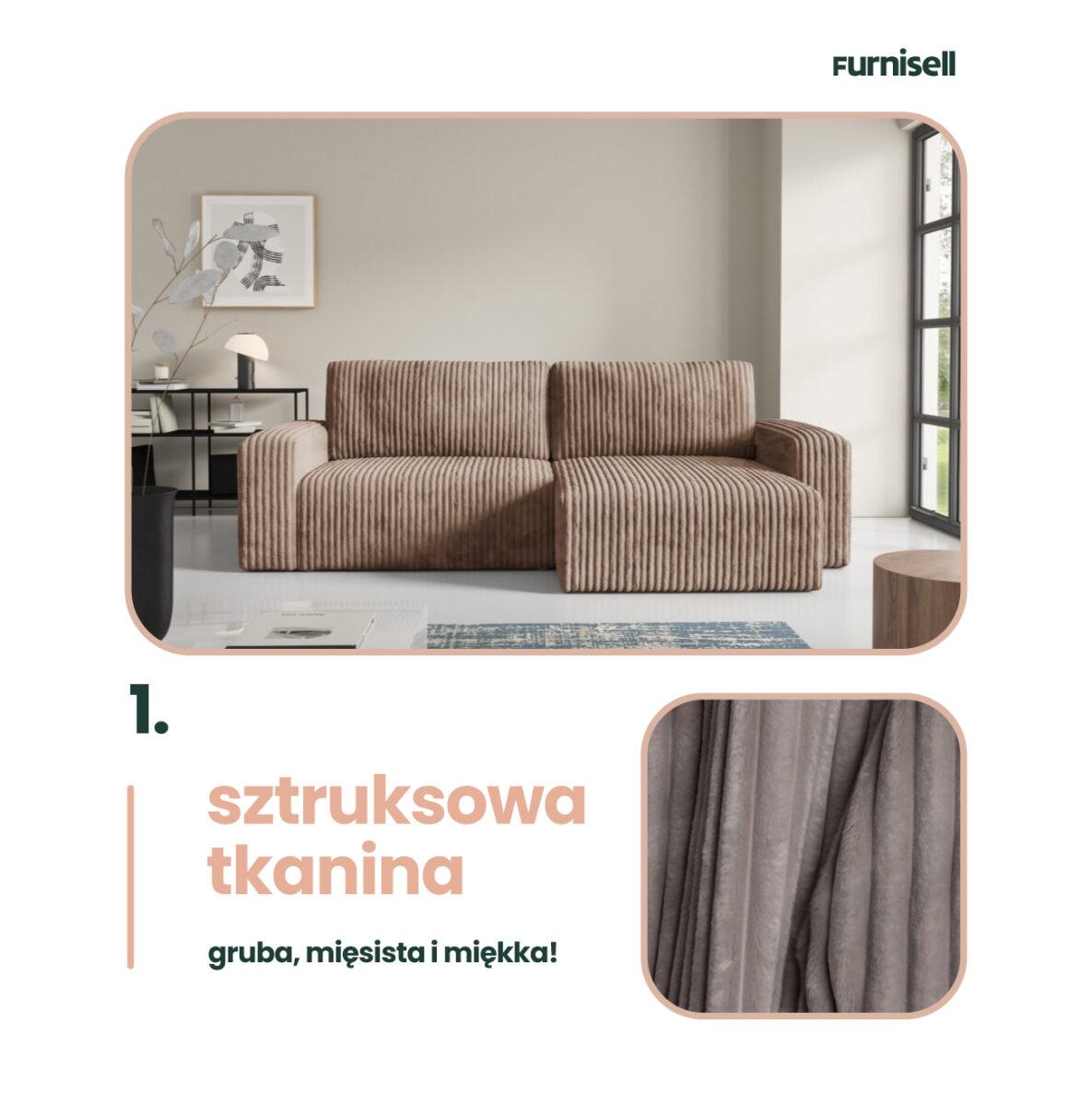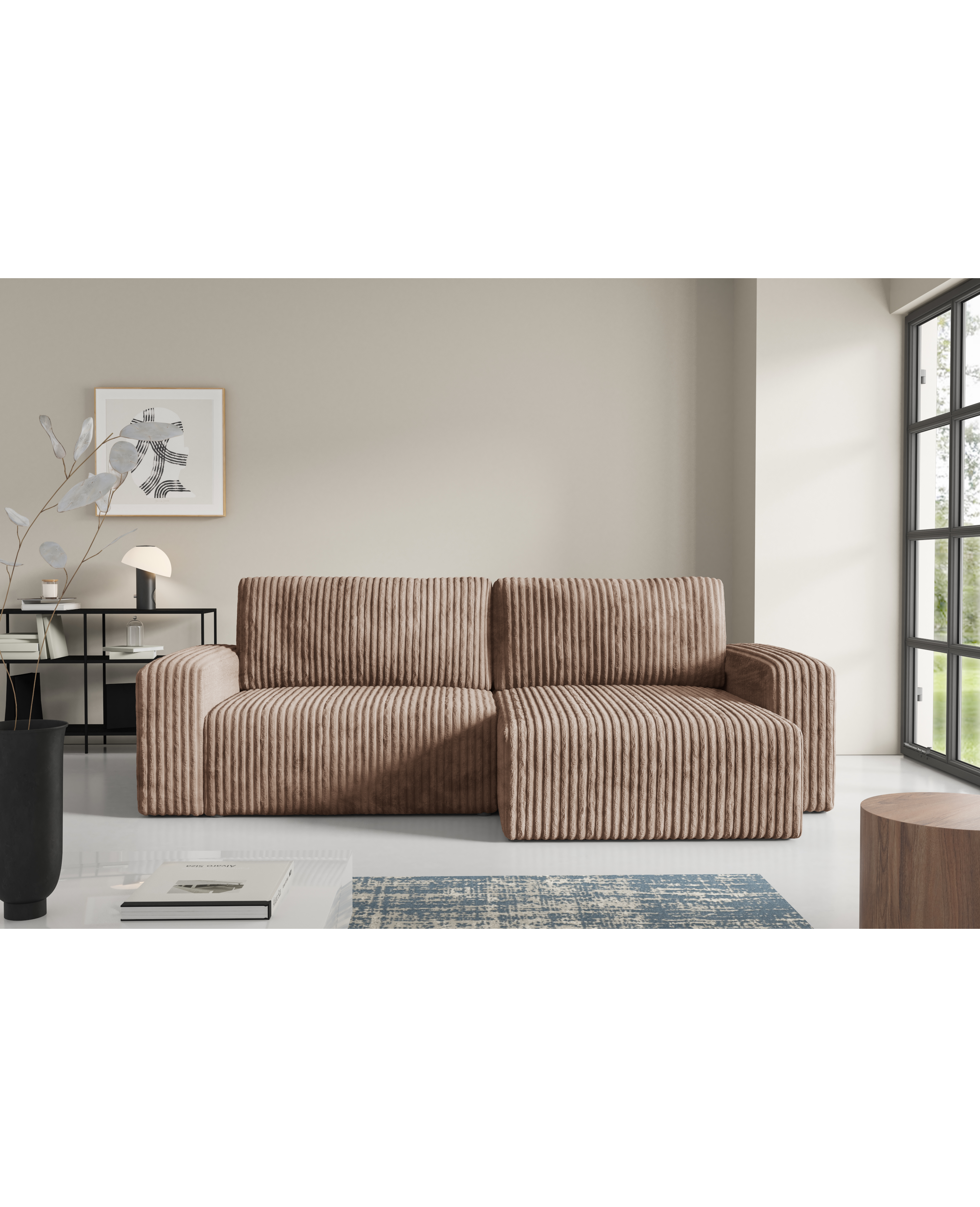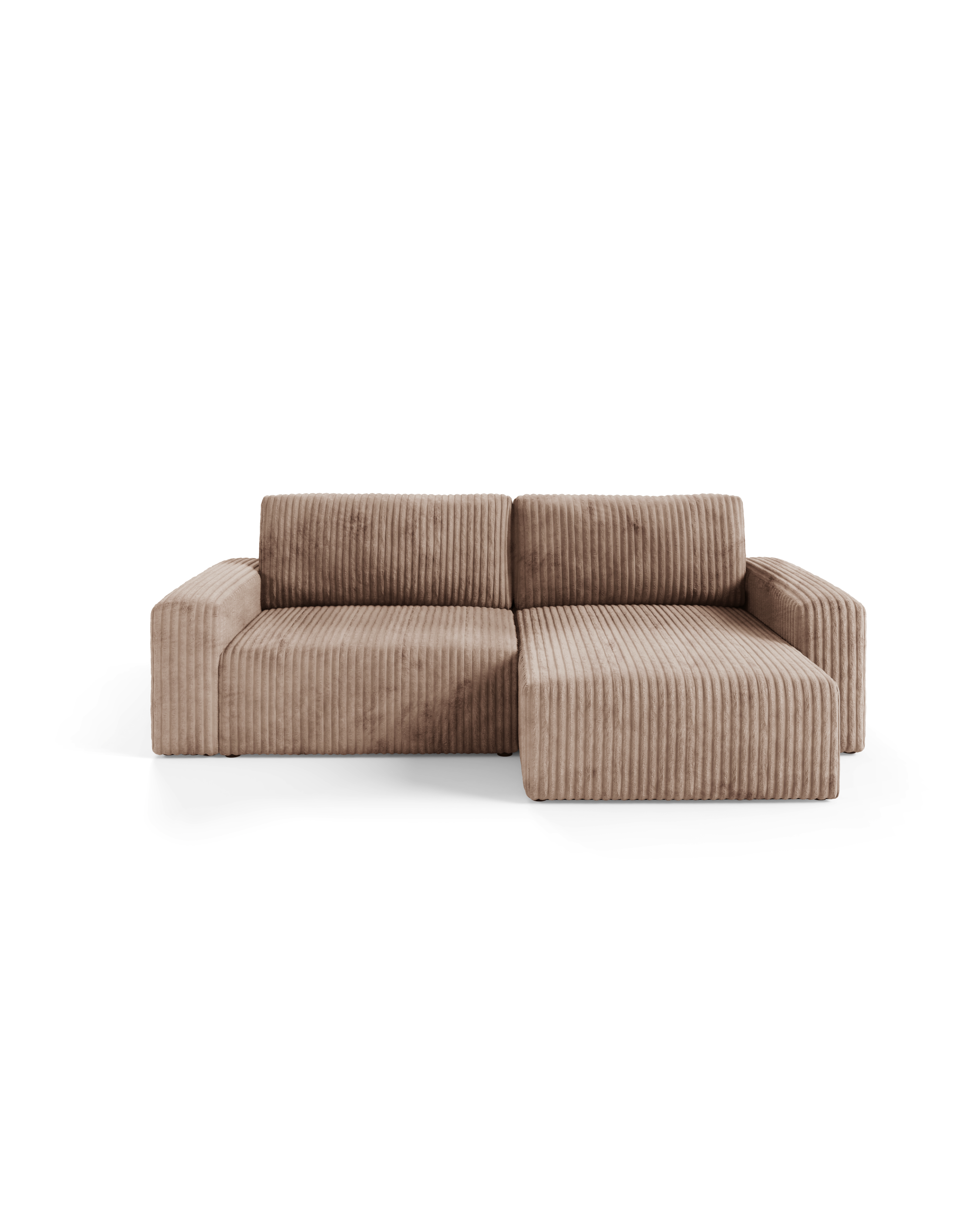 Obicie z miękkiego sztruksu Top Sztruks nadaje Fano niepowtarzalnego charakteru – struktura materiału dodaje mu wizualnej głębi i sprawia, że mebel jest przyjemny w dotyku, a jednocześnie praktyczny i trwały. Narożnik posiada funkcje spania oraz cechuje się komfortem siedzenia oraz nowoczesnym stylem, który znakomicie odnajduje się w przestronnych salonach, wnętrzach typu loft i nowoczesnych aranżacjach. Boki mebla podkreślają jego solidną sylwetkę, tworząc elegancką i spójną formę.