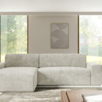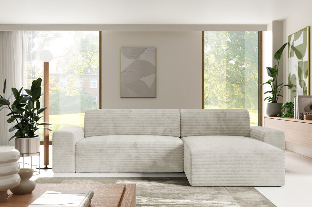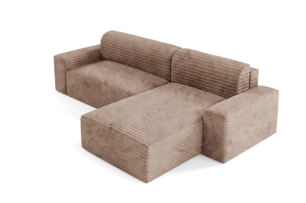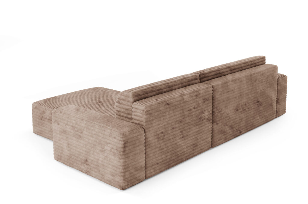 - Tył obity tym samym materiałem – dzięki temu narożnik może stać wolno i godnie prezentować się na środku salonu