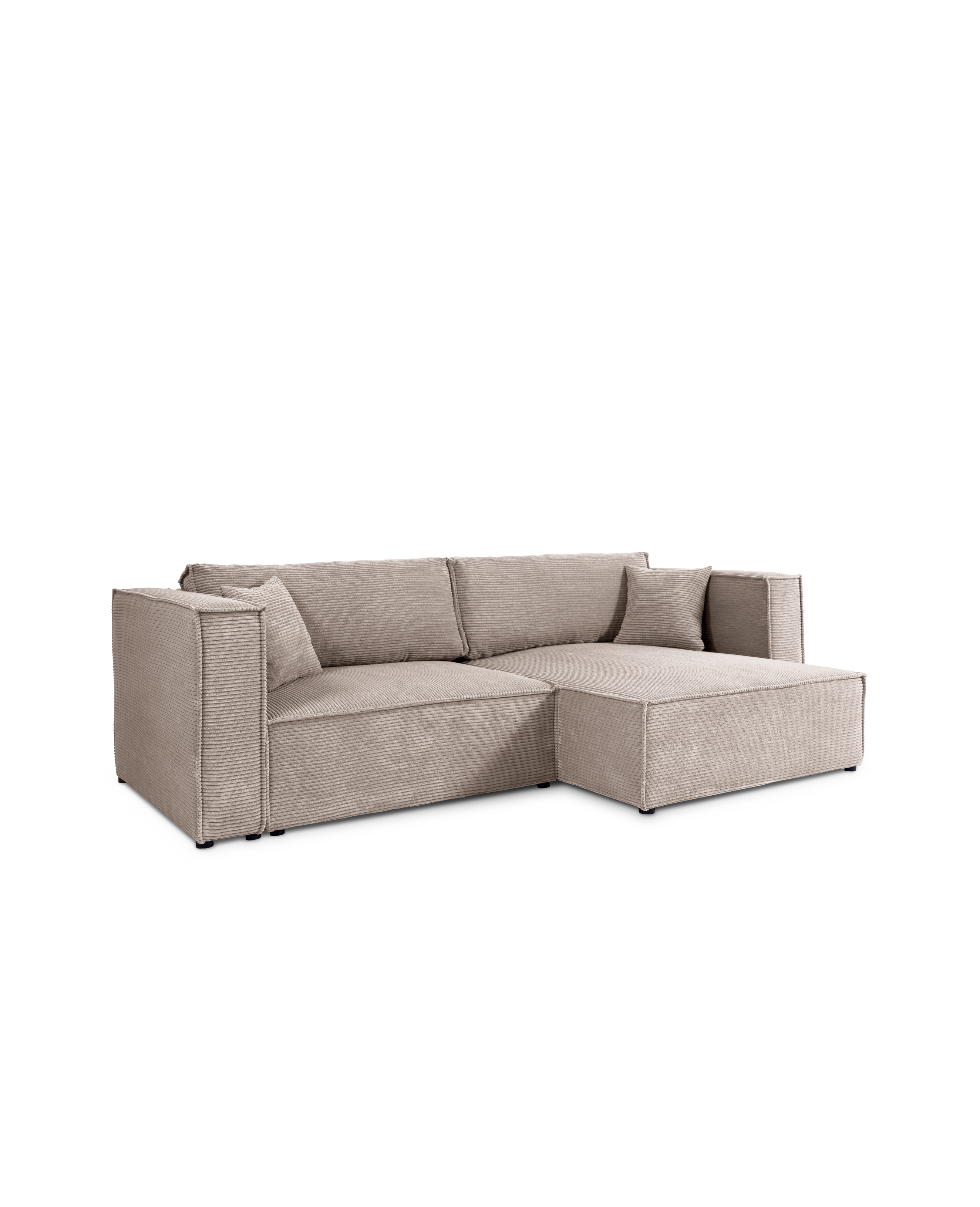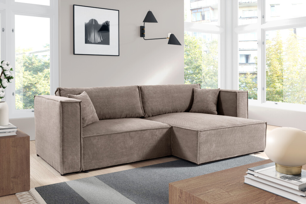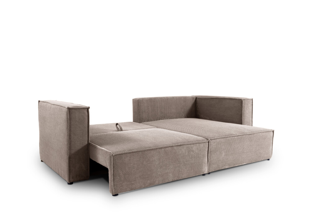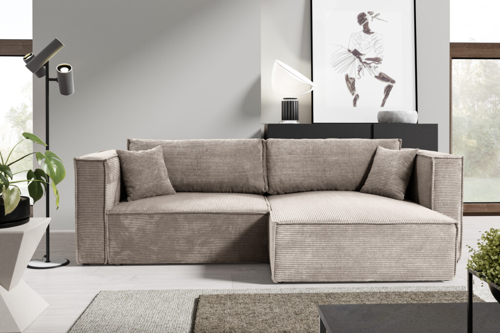 Narożnik Keymon łączy styl i komfort, wprowadzając wyjątkowy charakter do Twojego salonu. Wykonany z wysokiej jakości sztruksu, ten narożnik sztruksowy jest miękki w dotyku i łatwy do utrzymania w czystości. Dzięki funkcji spania, łatwo przekształcisz go w wygodne łóżko, co sprawia, że jest idealnym wyborem dla gości.