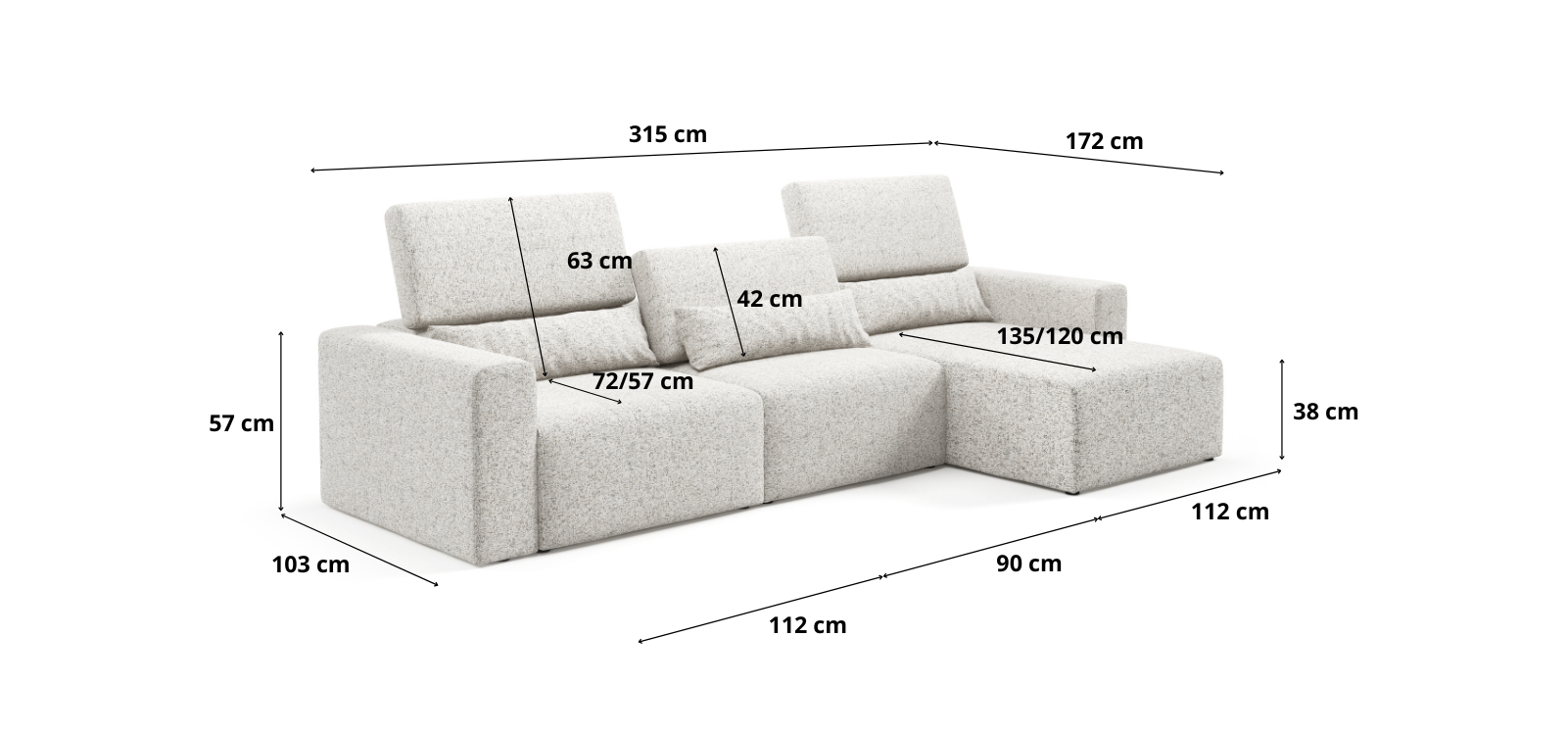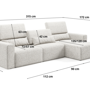 - Wymiary: szerokość 315 cm, głębokość 172 cm, wysokość 80/97cm