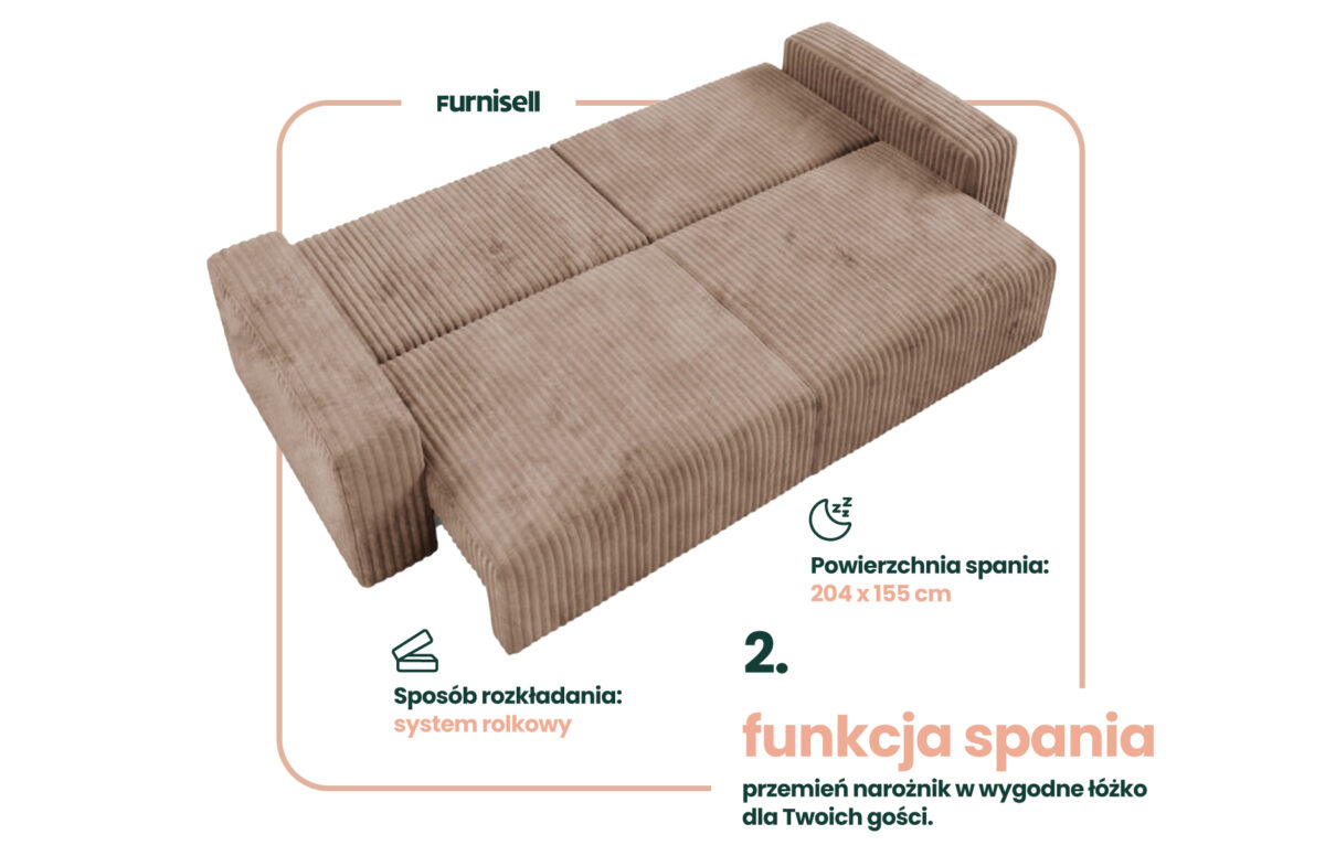 - Funkcja spania – powierzchnia spania 204 x 155 cm zapewni komfortowy sen nawet dla dwóch osób