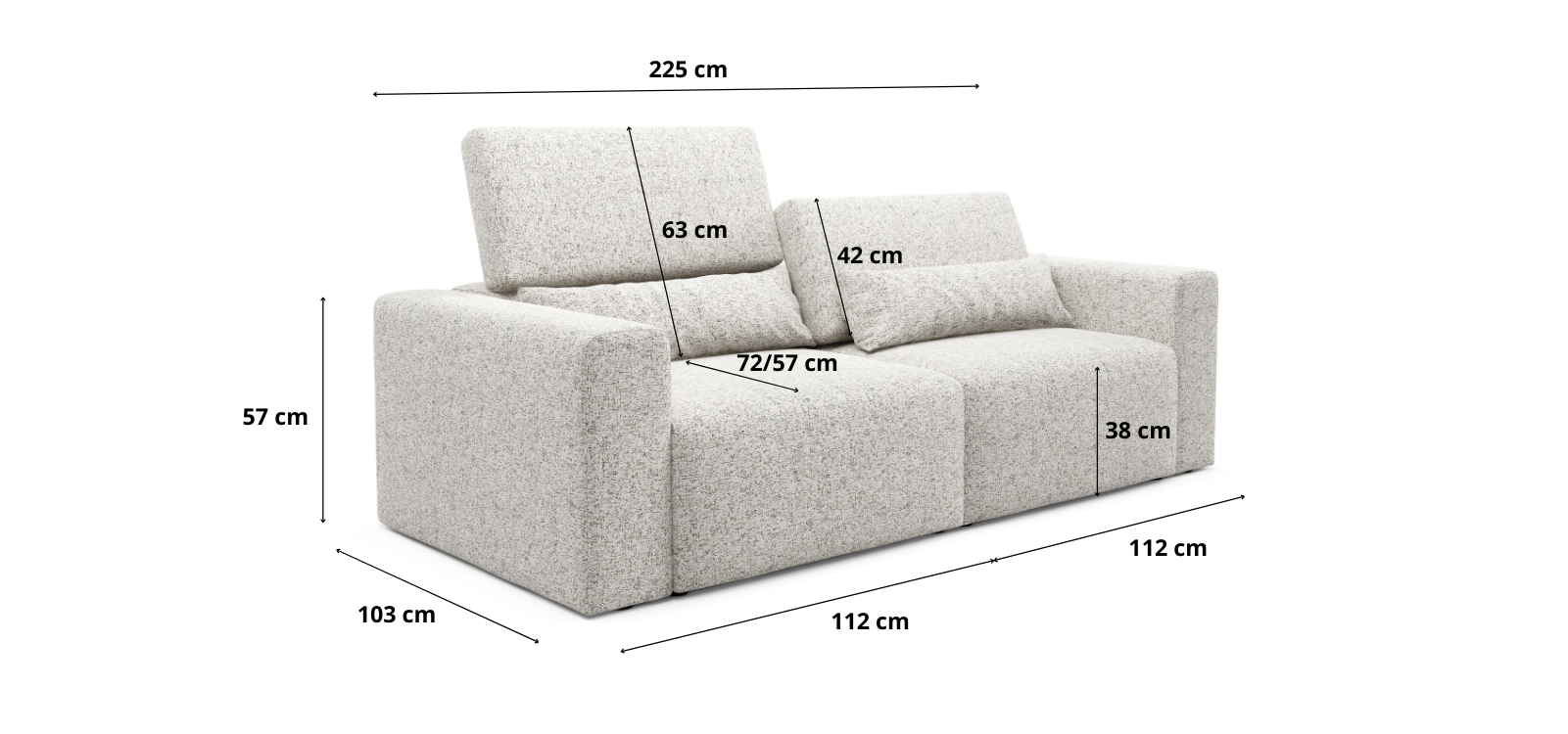 - Wymiary: szerokość 225 cm, głębokość 172 cm, wysokość 80/97cm